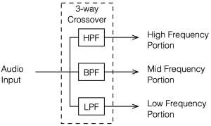 Crossovers with more outputs (e.g. Three- or Four-way crossovers) are also common. These would probably use one or more band-pass filters to separate the mid-band frequencies.