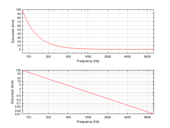 Another problem is that of loudspeaker excursion, how far it moves in and out in order to make sound. Although it’s not commonly known, the acoustic output level of a loudspeaker driver is proportional to its acceleration (which is a measure of its change in velocity over time, which are dependent on its excursion and the frequency it’s producing). The short version of this relationship is that, if you want to maintain the same output level, and you double the frequency, the driver’s excursion should reduce to 1/4. In other words, if you’re playing a signal at 1000 Hz, and the driver is moving in and out by ±1 mm, if you change to 2000 Hz, the driver should move in and out by ±0.25 mm. Conversely, if you halve the frequency to 500 Hz, you have to move the driver in and out with an excursion of ±4 mm. If you go to 1/10 of the frequency, the excursion has to be 100x the original value. For normal loudspeakers, this kind of range of movement is impractical, if not impossible.
